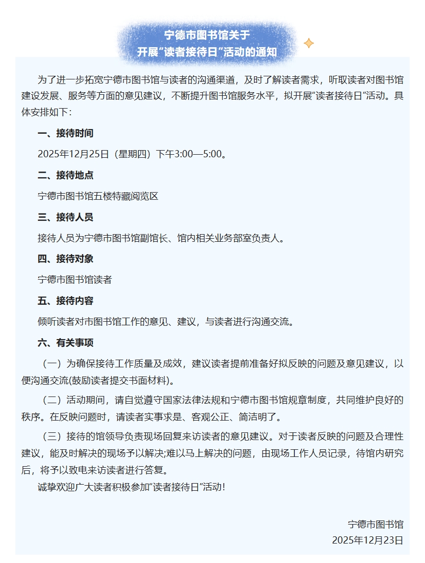 宁德市图书馆关于开展“读者接待日”活动的通知