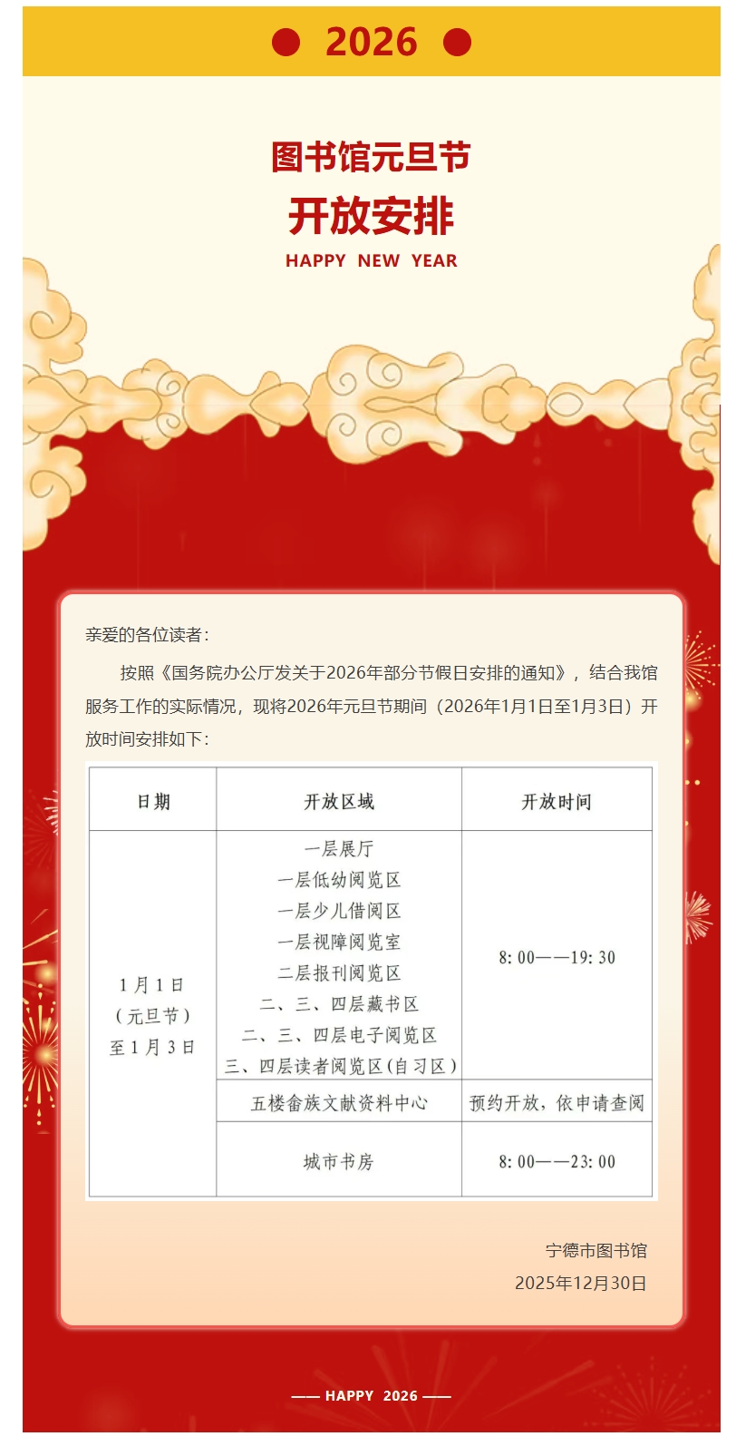 宁德市图书馆2026年元旦节期间开放安排