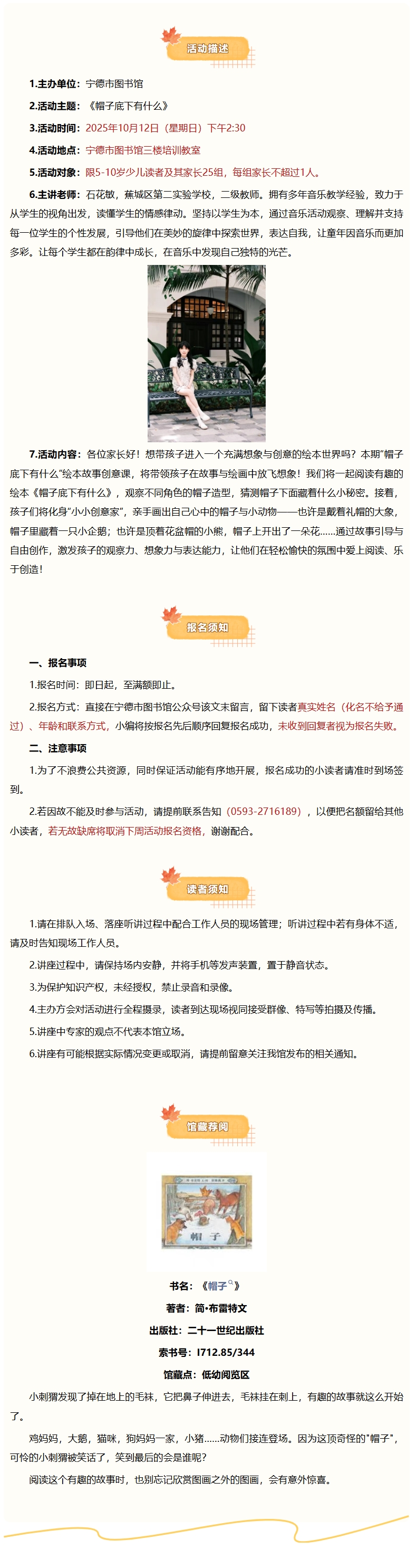 活动报名|第65期“打开绘本 悦读世界”少儿绘本故事会阅读推广活动:《帽子底下有什么》