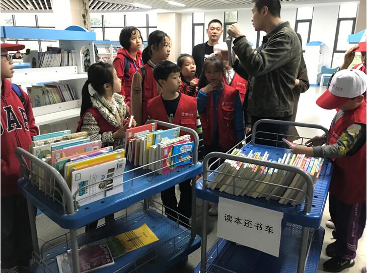 工作人员为小记者们讲解图书上架、整架等流程