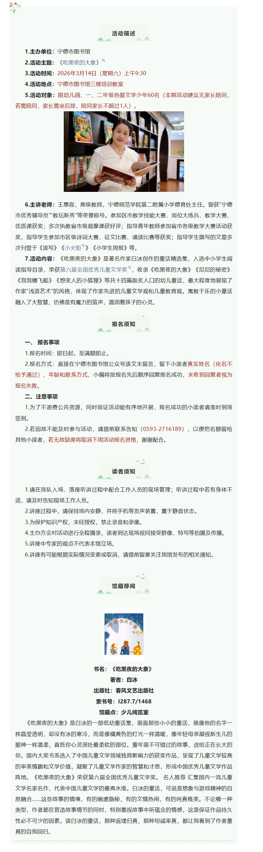 活动报名|第47期“宁图学堂·经典导读伴成长”品牌阅读活动:《吃黑夜的大象》